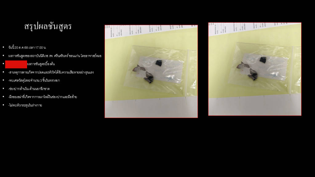 โดยมีรายละเอียดดังนี้ สาเหตุการตาย ปอดและหัวใจได้รับความเสียหายอย่างรุนแรง หลักฐานในร่างกาย พบเศษวัสดุโลหะจำนวน 3 ชิ้นในทรวงอก ซึ่งเป็นชิ้นส่วนจากการระเบิด บาดแผล ช่องปากด้านใน และด้านนอกฉีกขาดอย่างรุนแรง และมีรอยเขม่าที่เกิดจากการเผาไหม้ในช่องปากและมือซ้าย ส่วนประเด็นอื่น ไม่พบหัวกระสุนในร่างกาย สภ.เมืองหนองบัวลำภู ขอแสดงความเสียใจอย่างสุดซึ้งต่อครอบครัวผู้เสียชีวิต และขอใช้กรณีอันน่าสลดใจนี้ ฝากเตือนภัยไปยังผู้ที่ยังใช้บุหรี่ไฟฟ้าทุกท่าน ให้ตระหนักถึงอันตรายร้ายแรงที่ซ่อนอยู่จากความผิดพลาดของอุปกรณ์ โดยเฉพาะ "แบตเตอรี่" ที่สามารถระเบิดได้ตลอดเวลาและถึงแก่ชีวิต.