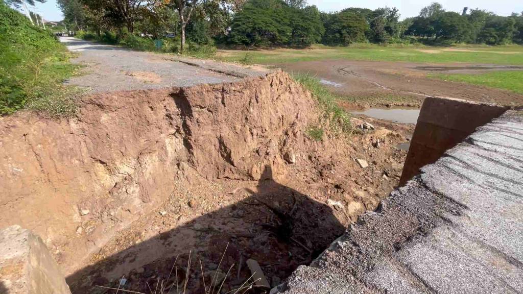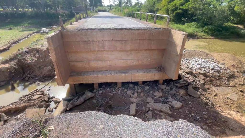 คอสะพานได้ขาดทำให้เด็กนักเรียนจะมาโรงเรียน และพี่น้องประชาชนสัญจรไปมาไม่ได้ ต้องใช้เส้นทางที่อ้อมซึ่งเป็นระยะทางไกลกว่าเดิม จากนั้นผู้สื่อข่าวจึงได้เดินทางไปตรวจสอบ จุดที่ได้รับแจ้งเป็นสะพานซึ่งอยู่ท้ายหมู่บ้าน บริเวณคอสะพาน 1 ฝั่งโดนน้ำกัดเซาะพังลงไปมีความลึกเกือบ 20 เมตร และความยาวประมาณ 10 เมตร บริเวณด้านข้างจะเป็นหนองน้ำสาธารณะประโยชน์ของหมู่บ้าน และสะพานดังกล่าวอยู่ห่างจากโรงเรียนยางหลวงพิทยาคมไม่ถึง 50 เมตร