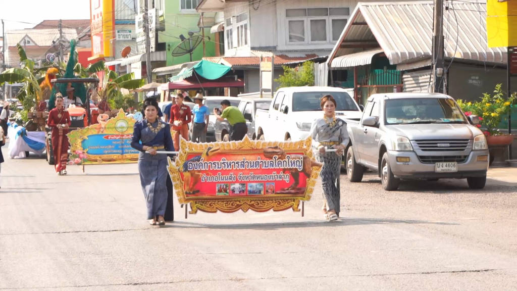 บรรยากาศเริ่มมีความคึกคักตั้งแต่ช่วงบ่าย เวลา 14.30 น. โดยขบวนแห่ศิลปวัฒนธรรมอันวิจิตรตระการตาจากตำบลต่างๆ ได้เริ่มเคลื่อนขบวนเข้าสู่หน้าเวทีกลาง สร้างความตื่นตาตื่นใจให้กับนักท่องเที่ยวและผู้มาร่วมงาน สะท้อนให้เห็นถึงความเข้มแข็งของชุมชนและเอกลักษณ์ทางวัฒนธรรมของชาวโนนสัง กระทั่งเวลา 17.30 น. เข้าสู่ช่วงไฮไลท์สำคัญ คือ พิธีบวงสรวงศาลหลักเมืองอำเภอโนนสัง ซึ่งถือเป็นศูนย์รวมจิตใจของชาวเมือง