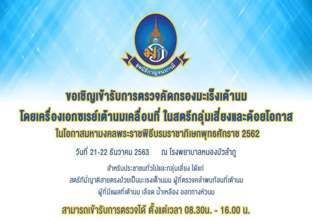 มูลนิธิกาญจนบารมี ขอเชิญเข้ารับการตรวจคัดกรองมะเร็งเต้านมโดยเครื่องเอกซเรย์เต้านมเคลื่อนที่ ในสตรีกลุ่มเสี่ยงและด้อยโอกาส ในโอกาสมหามงคลพะราชพิธีบรมราชาภิเษกพุทธศักราช 2562 วันที่ 21-22 ธันวาคม 2563 ณ โรงพยาบาลหนองบัวลำภู สำหรับประชาชนทั่วไปและกลุ่มเสี่ยง ได้แก่สตรีที่มีญาติสายตรงป่วยเป็นมะเร็งเต้านม ผู้ที่ตรวจคลำพบก้อนที่เต้านม ผู้ที่มีแผลที่เต้านม เลือด น้ำเหลือง ออกทางหัวนม สามารถเข้ารับการตรวจได้ ตั้งแต่เวลา 08.30น. - 16.00 น.