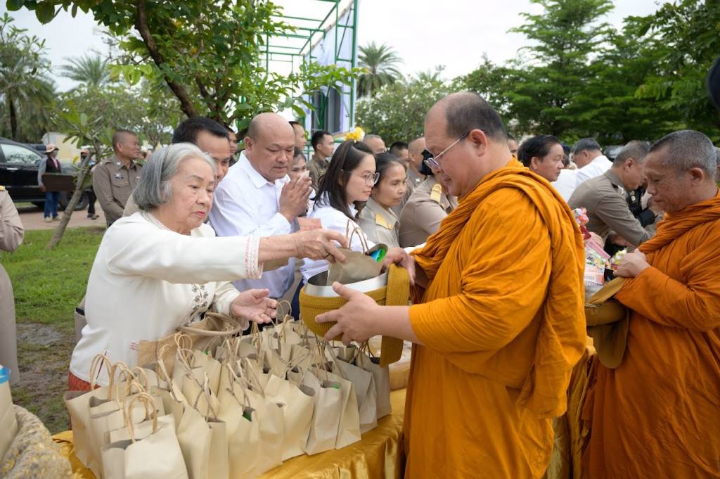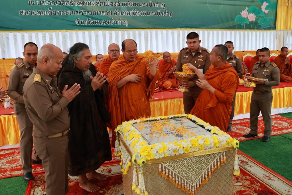 พร้อมด้วยผู้ว่าราชการจังหวัด หัวหน้าส่วนราชการ และแขกผู้มีเกียรติร่วมในพิธี พระสงฆ์เจริญชัยมงคลคาถา เพื่อเป็นการอำนวยอวยพรให้การก่อสร้างสำเร็จลุล่วงไปด้วยดี หลังจากพิธีเจริญพระพุทธมนต์ นายสุรศักดิ์ อักษรกุล ผู้ว่าราชการจังหวัดหนองบัวลำภู ได้นำหัวหน้าส่วนราชการ ข้าราชการ และพุทธศาสนิกชนที่มาร่วมงาน ร่วมกันทำบุญตักบาตรข้าวสารอาหารแห้งแด่พระสงฆ์ทั้ง 33 รูป เพื่อสร้างกุศลและอุทิศส่วนกุศล ซึ่งเป็นประเพณีที่ชาวพุทธปฏิบัติสืบต่อกันมาแต่โบราณ.
