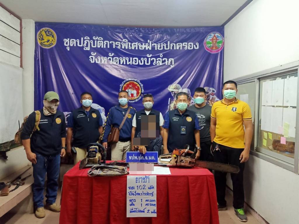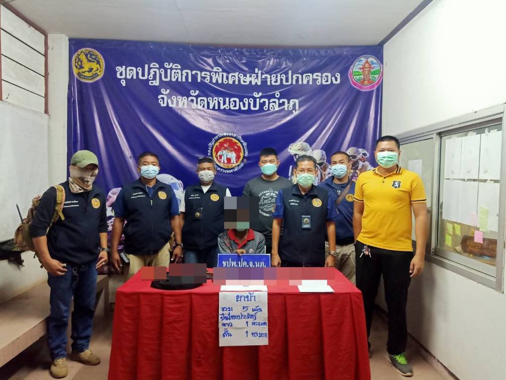 เมื่อวันที่ 20 พ.ค.2565 ผู้สื่อข่าวรายงานว่า นางศิวพร ฉั่วสวัสดิ์ ผู้ว่าราชการจังหวัดหนองบัวลำภู ได้สั่งการให้ทุกพื้นที่ในเขต จ.หนองบัวลำภู ให้ออกหาข่าวและจับกุมผู้ที่ยุ่งเกี่ยวกับยาเสพติด ต่อมาชุดปฎิบัติการพิเศษฝ่ายปกครองจังหวัดหนองบัวลำภู นำโดยนายประสิทธิ์ มหาวงค์ ผู้ช่วยป้องกันจังหวัดหนองบัวลำภู ,นายธวัชชัย วงษ์แสน ปลัดฝ่ายความมั่นคงอำเภอศรีบุญเรือง,มญ.เสถียน สุกุมาลย์ ,มญ.ประจัก พลท้าว,อส.อ.ศักดิ์สิทธิ์ นนมุด,อส.ตรี ปกรณ์เกียรติ พรมโคตร,อส.วิทวัส บังใบ ได้ร่วมกันจับกุมนายสงกรานต์ อายุ 42 ปี ( นามสมมุติ) บ้านหนองแสง ต.หัวนา อ.เมือง จ.หนองบัวลำภู ของกลางยาบ้า 102 เม็ด พร้อมผลตรวจปัสสาวะเป็นสีม่วง ปืนไทยประดิษฐ์ (ปืนแก๊ป) จำนวน 2 กระบอก (สั้น 1 กระบอก และยาว 1 กระบอก) เลื่อยโซ่ยนต์ 2 เครื่อง สามารถจับกุมได้ที่บริเวณเถียงนา บ้านหนองแสง ต.หัวนา อ.เมือง จ.หนองบัวลำภู