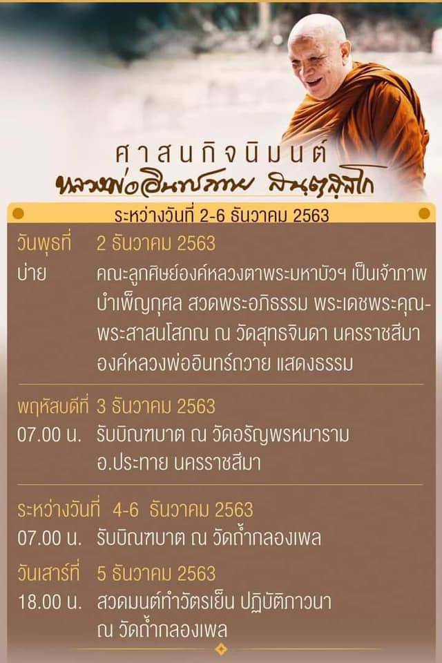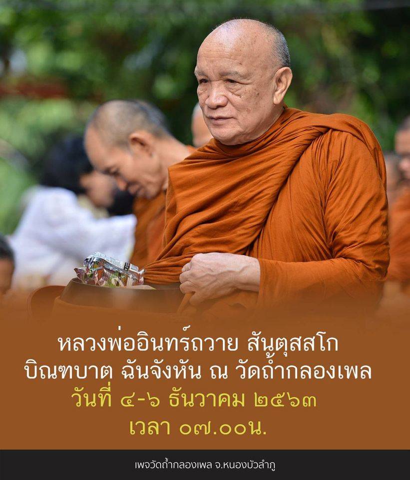 หลวงพ่ออินทร์ถวาย สันตุสสโกบิณฑบาต ฉันจังหัน ณ วัดถ้ำกลองเพลวันศุกร์ที่ ๔ ถึง วันอาทิตย์ที่ ๖ ธันวาคม ๒๕๖๓ เวลา ๐๗.๐๐ น.