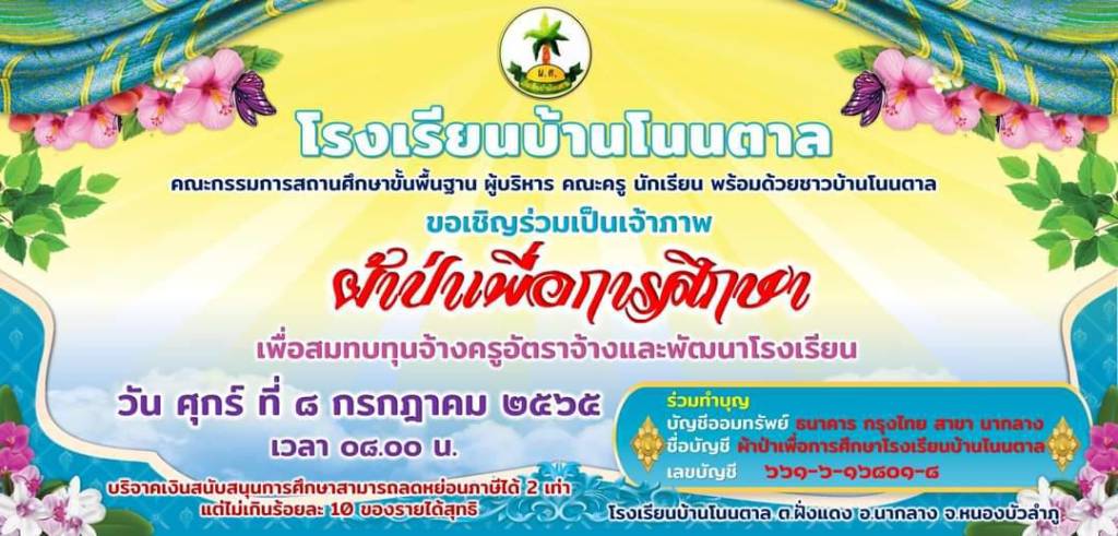 ขอขอบคุณพี่ๆ ทีมงานไบเกอร์และผู้สนับสนุนทุกท่านที่ร่วมทำบุญในครั้งนี้ค่ะ ผ้าป่าเพื่อการศึกษา เพื่อสมทบทุนจ้างครูอัตราจ้าง และพัฒนาโรงเรียนโรงเรียนบ้านโนนตาล ตำบลฝั่งแดง อำเภอนากลาง จังหวัดหนองบัวลำภู เนื่องจากโรงเรียนแห่งนี้เป็นโรงเรียนขนาดเล็กระดับอนุบาลถึง ป.6 ขณะนี้มีนักเรียน 48 คน แต่มีคุณครูไม่เพียงพอ ต่อจำนวนชั้นของนักเรียนอีกทั้งยังขาดอุปกรณ์หลายอย่าง ทั้งทางด้านการเรียนและอุปกรณ์กีฬา ทางคณะกรรมการสถานศึกษาผู้บริหาร คณะครูนักเรียน พร้อมด้วยชาวบ้านโนนตาล จึงขอเชิญผู้มีจิตศรัทธาร่วมเป็นเจ้าภาพผ้าป่าเพื่อการศึกษาในครั้งนี้ค่ะ