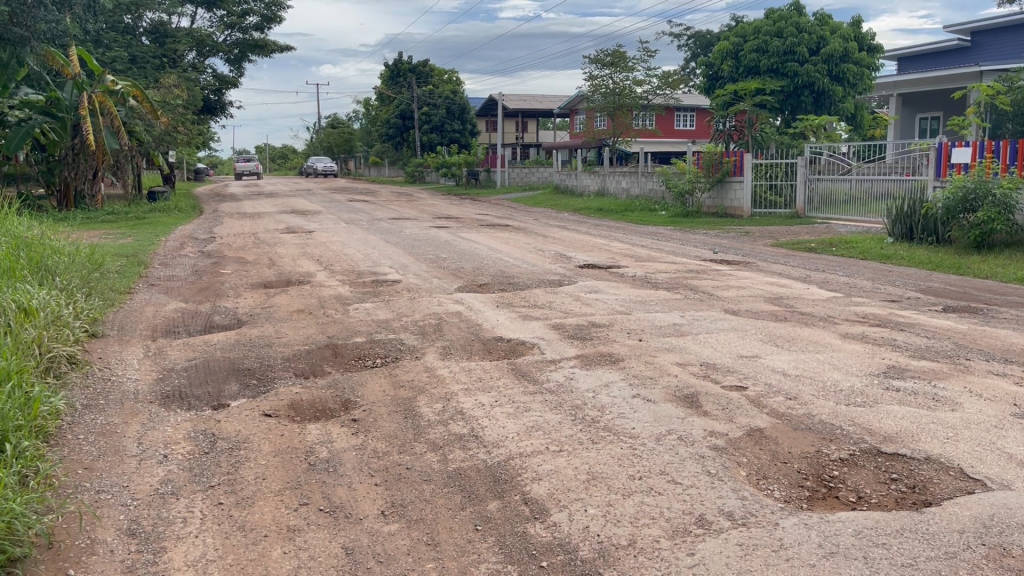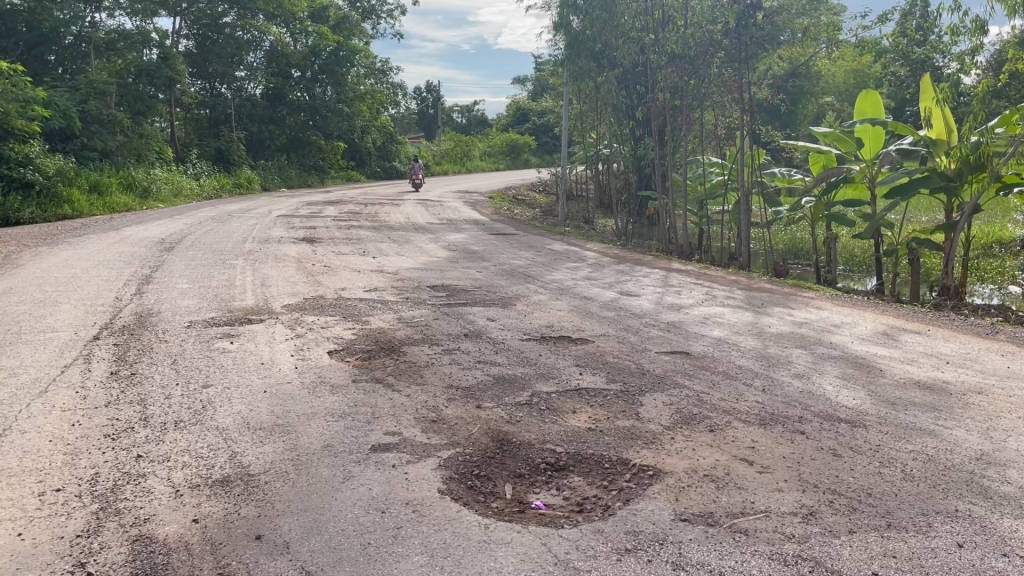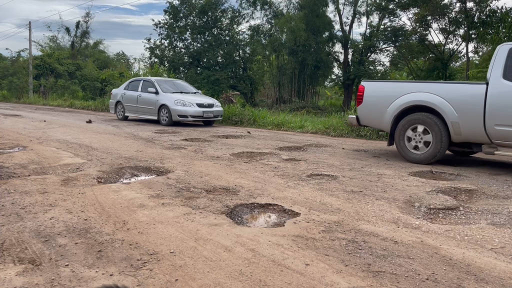 ชาวบ้านหนองบัวลำภูสุดทนถนนพังเป็นหลุมเป็นบ่อเอาต้นกล้วยมาปลูกลงไปอาบน้ำในหลุมลึกมีน้ำท่วมขัง