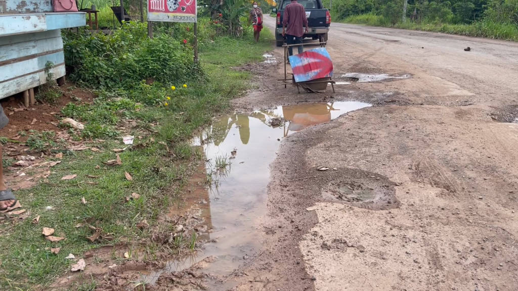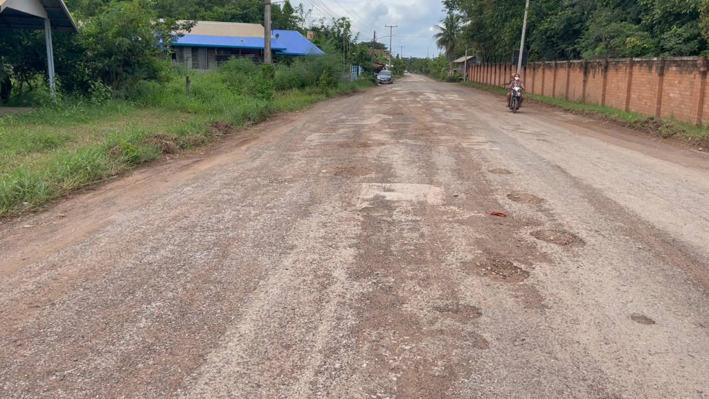 ส่วนช่วงหน้าแล้งก็มีฝุ่นคลุ้งไปทั่วบริเวณ ถนนเส้นนี้สร้างมาแล้วหลายปี หน่วยงานที่ดูแลก็ไม่ค่อยมาซ่อมแซม นานๆครั้งจึงจะนำหินหรือดินมาถมหลุม แต่พอหน้าฝนก็พังเหมือนเดิม ถนนเส้นนี้เป็นเส้นหลักที่พี่น้องเรานำพืชผลทางการเกษตร เข้าไปจำหน่ายหารายได้เลี้ยงครอบครัว สภาพอย่างที่เห็นบางจุดแทบจะไม่มีลาดยาง มีแต่เม็ดหินโผล่ขึ้นมา